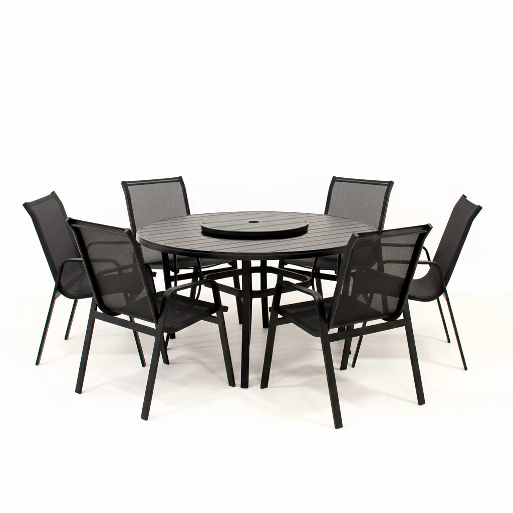 Fabricado com estrutura em alumínio reforçado e acabamento em pintura eletrostática, o kit não enferruja e suporta sol, chuva e umidade. As cadeiras contam com assento e encosto em Tela Sling, material confortável, de secagem rápida e resistente aos raios UV, ideal para áreas de piscina.