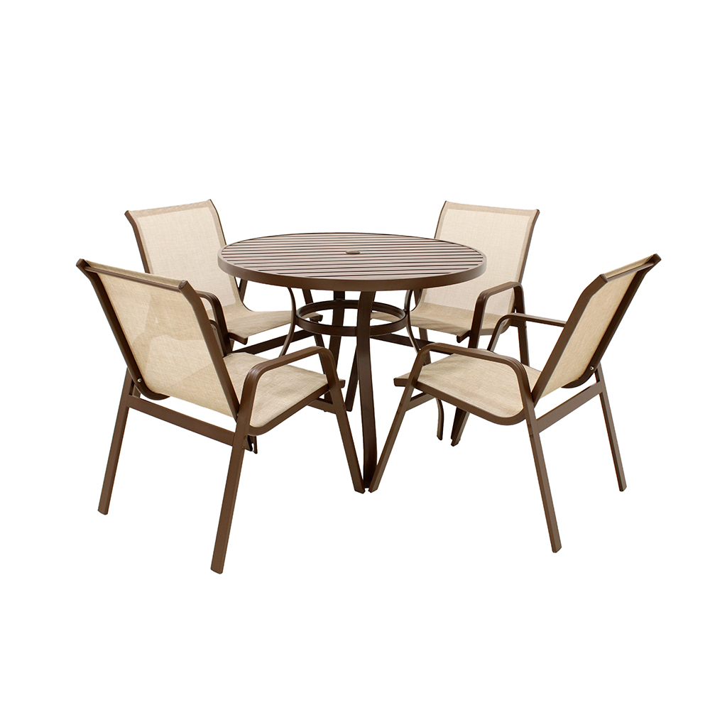 Produzido com estrutura em alumínio reforçado, o conjunto é resistente ao sol, chuva e maresia, não enferruja e exige baixa manutenção. As poltronas com tela sling oferecem conforto térmico e excelente durabilidade.