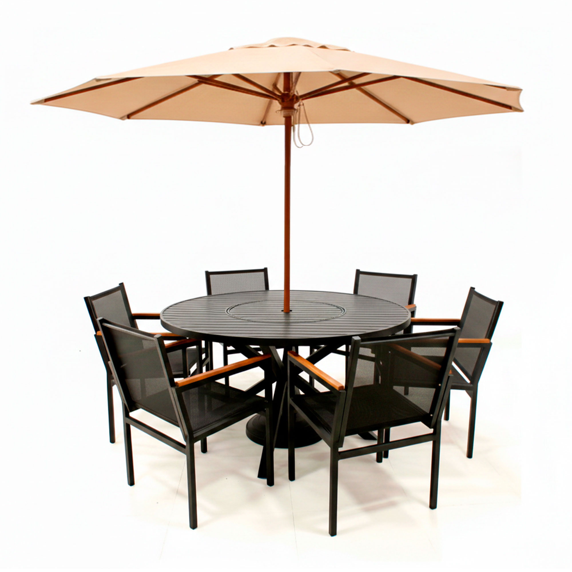 Conjunto de Mesa de Alumínio com Tampo Giratório, 6 Cadeiras e ombrelone. Pode ser usado em área externa e interna.