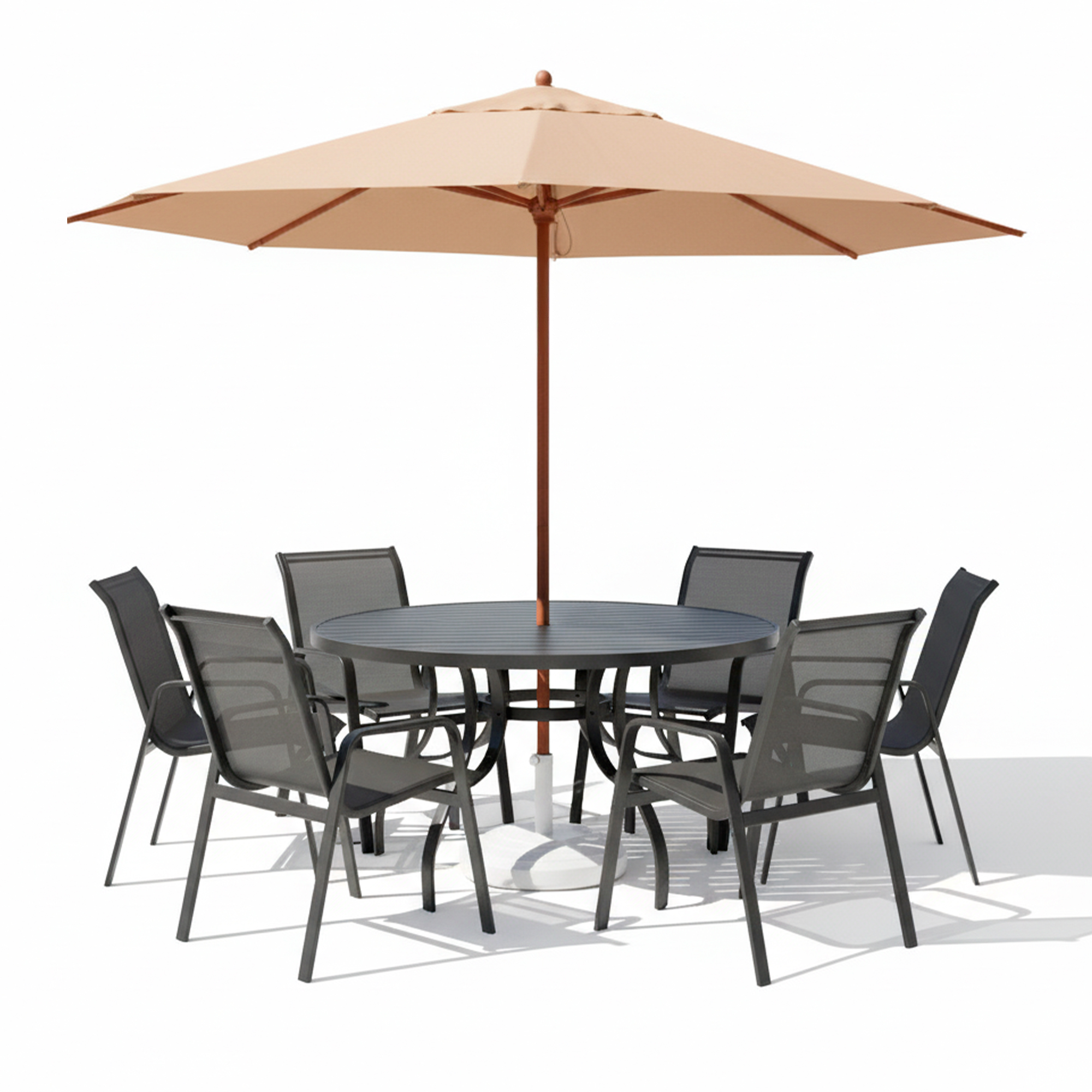 Conjunto Lótus com mesa de 1,40m + 6 Poltronas + Ombrelone e Base
