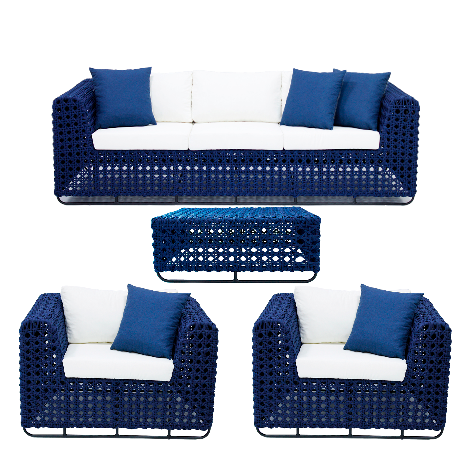 Jogo conjunto de sofá de área externa em corda náutica e alumínio com 2 poltronas individuais e mesinha de centro.